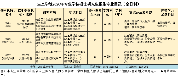 丽水学院生态学院2026年专业学位硕士研究生招生专业目录(全日制)