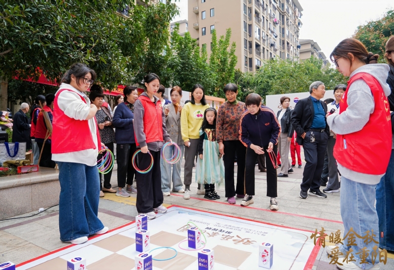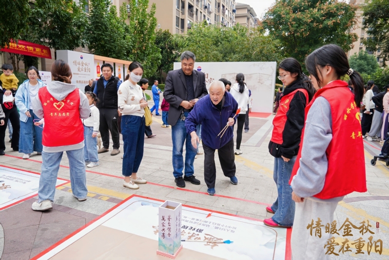 志愿服务活动围绕“温情陪伴”与“文化传承”两大主线开展。在精心设置的互动区域,志愿者们引导社区老人参与趣味套圈和传统投壶。这些富含传统趣味的游戏,不仅成功唤起了老一辈的童年记忆,拉近了代际距离,更让重阳节的文化内涵在欢声笑语中得到感知与传承。