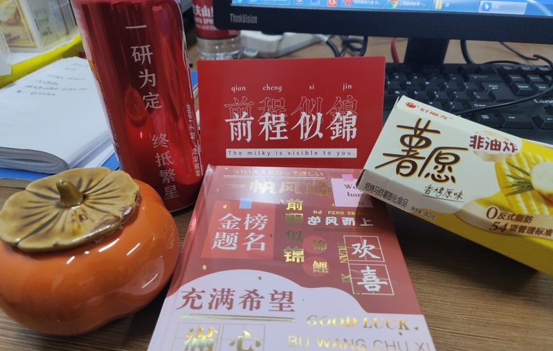 此次发放的礼包独具匠心,每一件物品都承载着深切的祝福:“前程似锦”明信片,寄托着对学子光明未来的殷切期望;“金榜题名”笔记本,预祝同学们笔下生辉,得偿所愿;“柿柿如意”茶罐,愿备考之路一切顺利;谐音“夙愿”的薯愿薯片,期盼学子梦想成真;更有印着“一研为定、终抵繁星”字样的定制可乐,坚定考研学子们的决心,照亮其前行之路。
