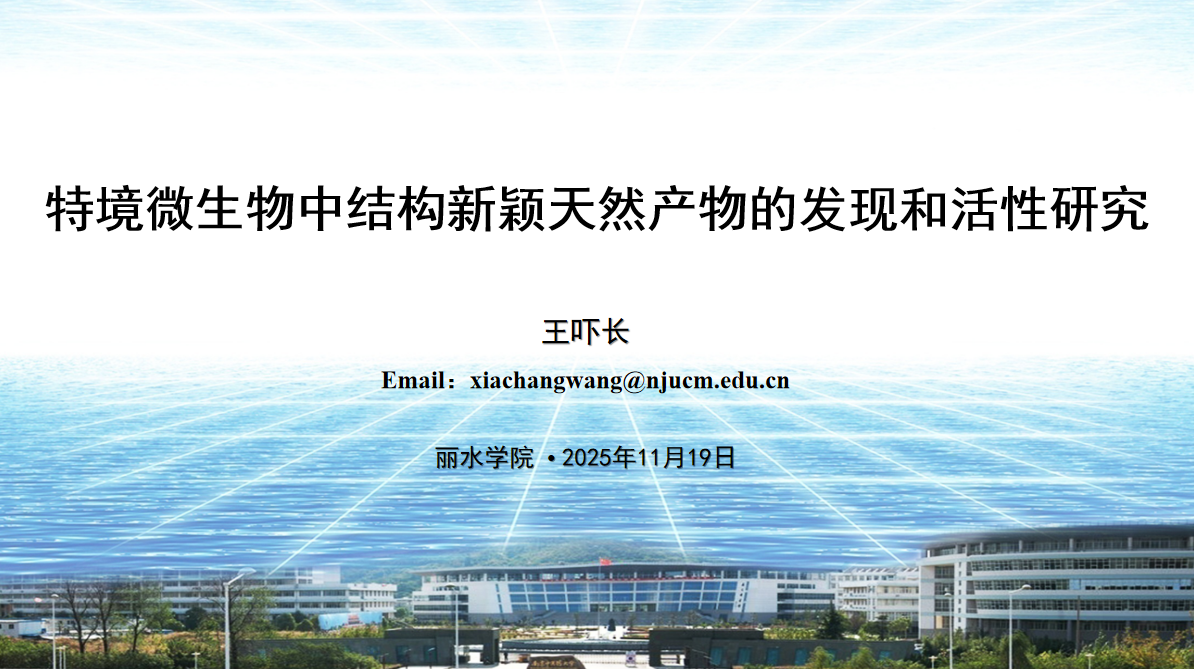 2025年11月19日,南京中医药大学药学院王吓长教授受邀莅临丽水学院,为农业与生物技术学院研究生和青年教师群体带来了一场题为《特境微生物中结构新颖天然产物的发现和活性研究》的专题讲座。由农业与生物技术学院科研院长朱强根教授主持,本次讲座聚焦天然药物领域,系统阐述了特境微生物和中药内生菌在天然产物开发中的突破性进展,为青年科研人员提供了创新研究范式。