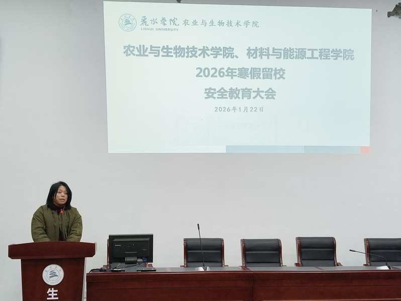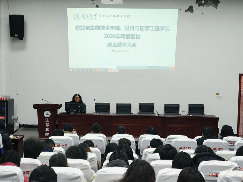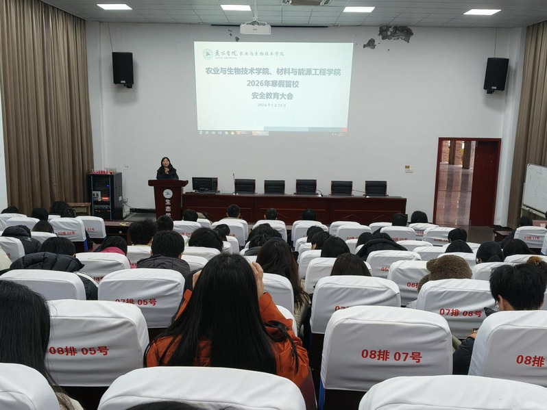 为进一步加强农业与生物技术学院、材料与能源工程学院2026年寒假留校学生安全管理工作,切实提升留校学生安全防范意识,1月22日下午16:45,两院在2号阶梯教室召开寒假留校学生安全教育大会。会议由农业与生物技术学院学还学生科科长施婷主持,农业与生物技术学院党委副书记吴庆红,两院学生科全体辅导员及全体寒假留校学生参加会议。