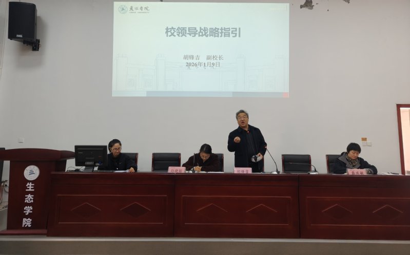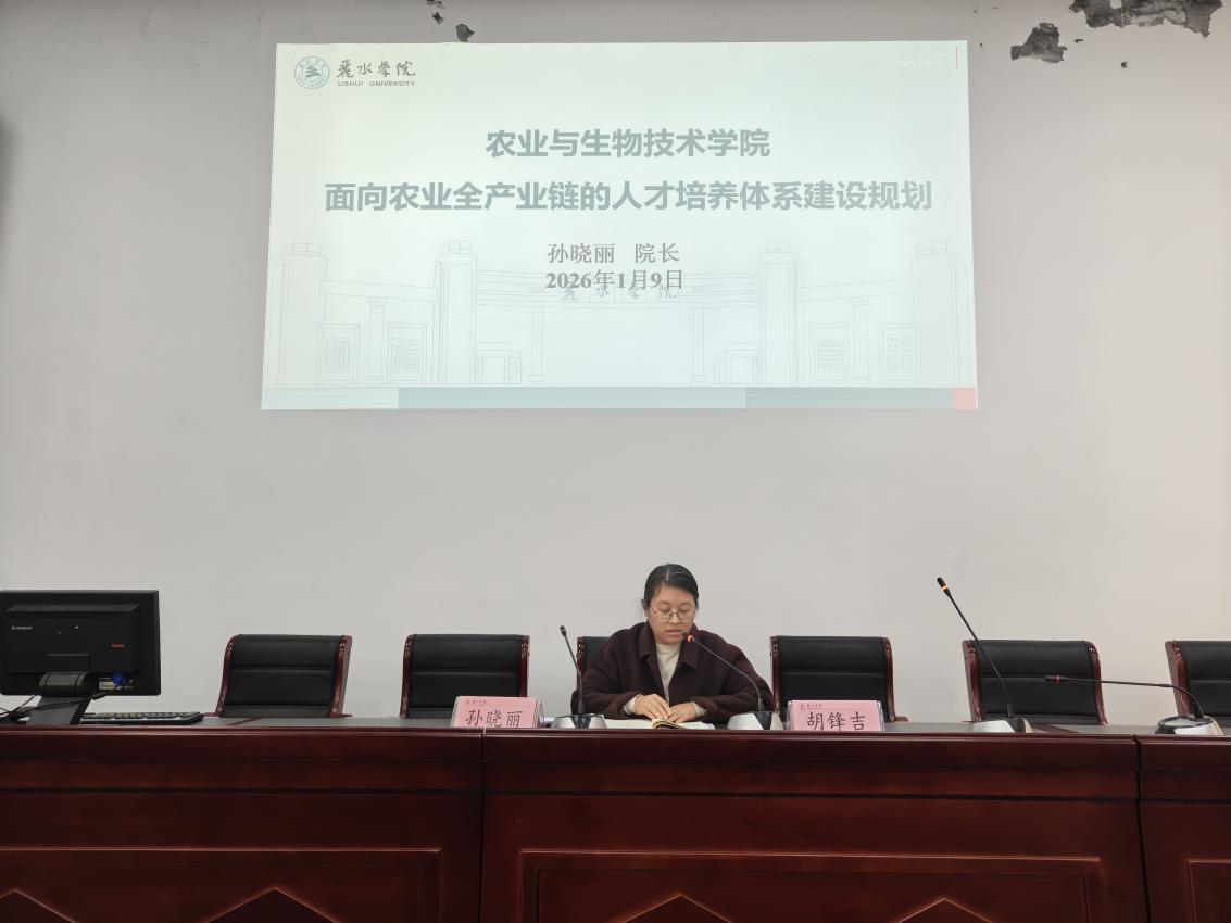 2026年1月9日,农业与生物技术学院召开以“破冰·融合·赋能——新学院面向产业的人才培养模式改革”为主题的教学工作专题会议,系统谋划“十五五”期间人才培养体系的建设方向与改革路径。副校长胡锋吉出席会议并作重要讲话,教务处(医学部)副处长戴庆敏陪同参会。院长孙晓丽作专题汇报,学院全体教职工参加会议。